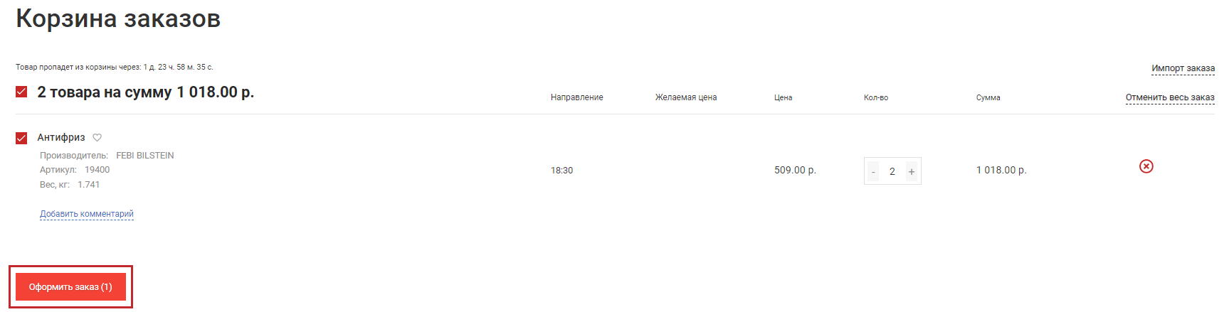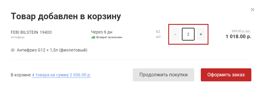 - Выберите подходящее предложение, нажмите на кнопку "Корзина" (рис. 1), укажите количество товара, добавьте деталь в Корзину. (рис. 2)